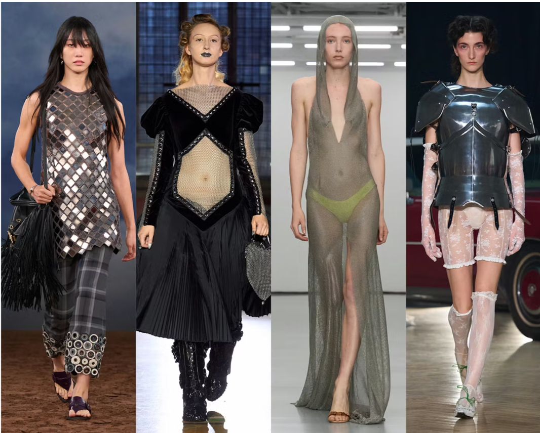 Designers like Burberry, Conner Ives, Chopova Lowena, Colleen Allen, Yuhan Wang showcased armor-like aesthetics and designs. With also medieval protective gear, mini dresses in a chain mesh pattern worn over slacks, demi-couture chainmail gown made entirely of stainless steel, black hooded gown and even a knight’s breastplate.